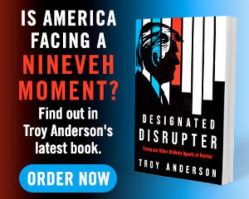 Preorder Now! Designated Disrupter: Trump and Other Unlikely Agents of Revival (Charisma House/FrontLine, January 6, 2026) by Pulitzer Prize–nominated journalist and six-time #1 bestselling author Troy Anderson. America stands at a crossroads. In Designated Disrupter, Anderson reveals how God is using unexpected leaders to ignite a Great Awakening, mostly among young people. Preorder today and be part of the movement!